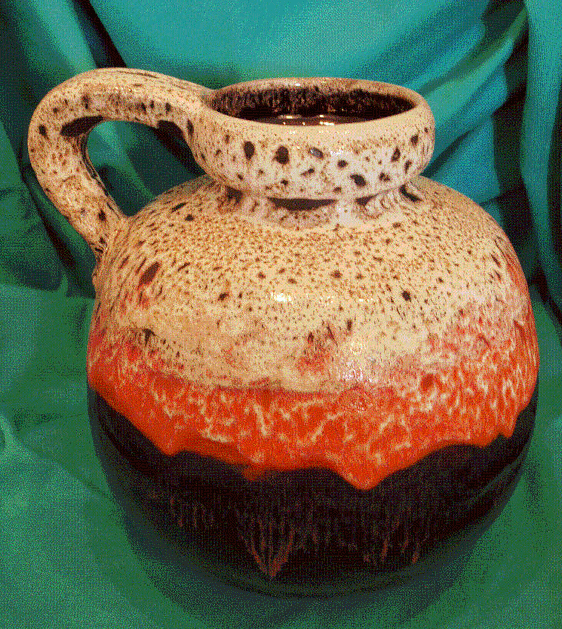 The BMP Apollo Series from the late 1970s consisted of nine different mold shapes. Each piece was unique and consisted of a variation of heavy applied glaze, reminiscent of West Germany’s Fat Lava glazes. The Apollo line has heavy white, orange and brown glazes.