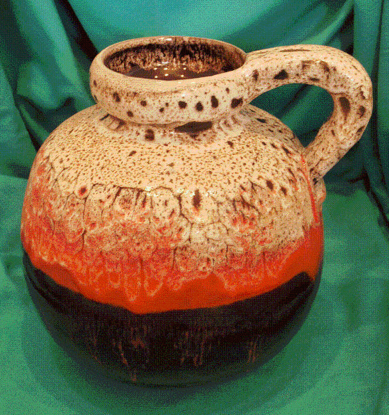 The BMP Apollo Series from the late 1970s consisted of nine different mold shapes. Each piece was unique and consisted of a variation of heavy applied glaze, reminiscent of West Germany’s Fat Lava glazes. The Apollo line has heavy white, orange and brown glazes.