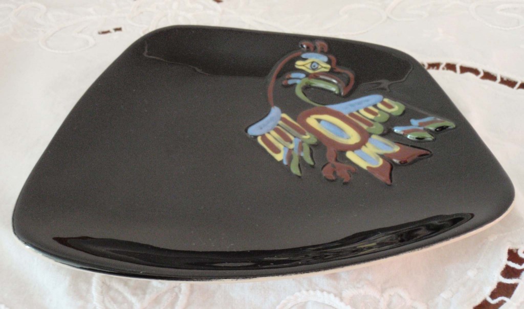 Colour: gloss black glaze, applied raised First Nations style design of eagle, multicoloured eagle