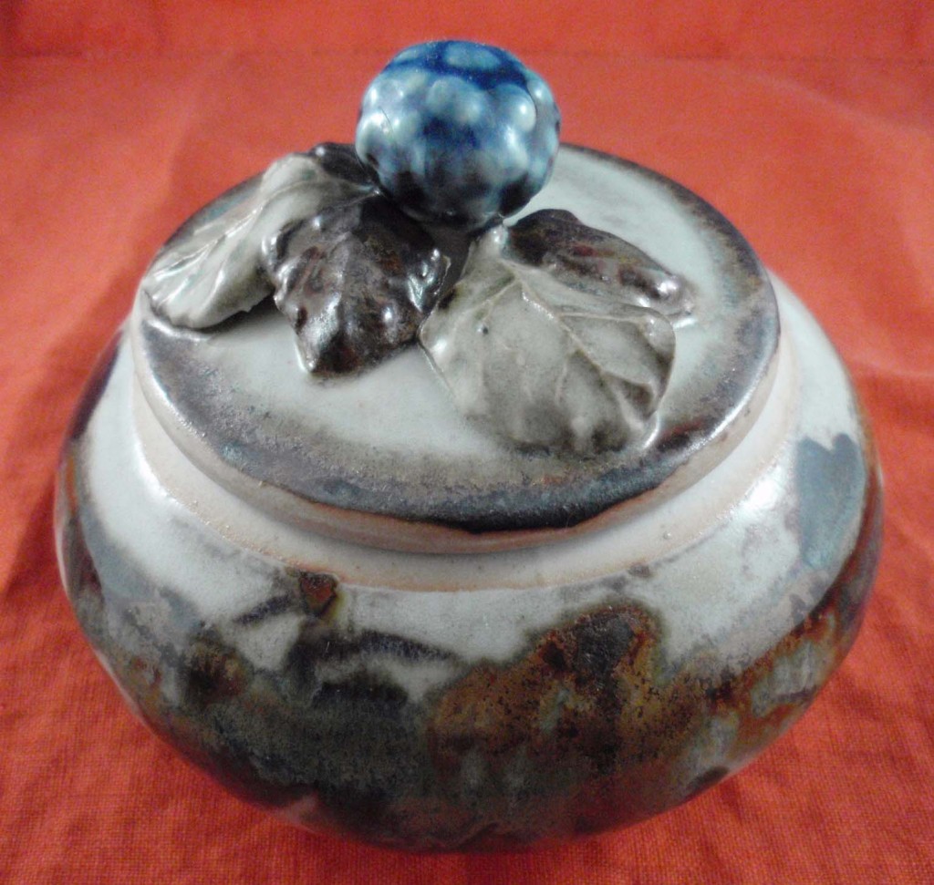 Shape: shallow, bulbous, lid has blackberry & leaves for finial