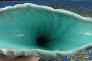 - High gloss mottled turquoise glaze with mottled brown highlights
