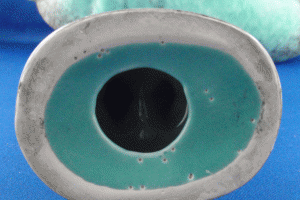 - Turquoise to mottled grey high gloss glaze