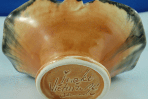 I recently been given a brown and cream bowl with a sail boat. The sail boat is etched in brown also the bowl has a brown rim.the back is signed Ineke Victoria Canada. I grew up in Victoria and this bowl reminds me of the swifture races.