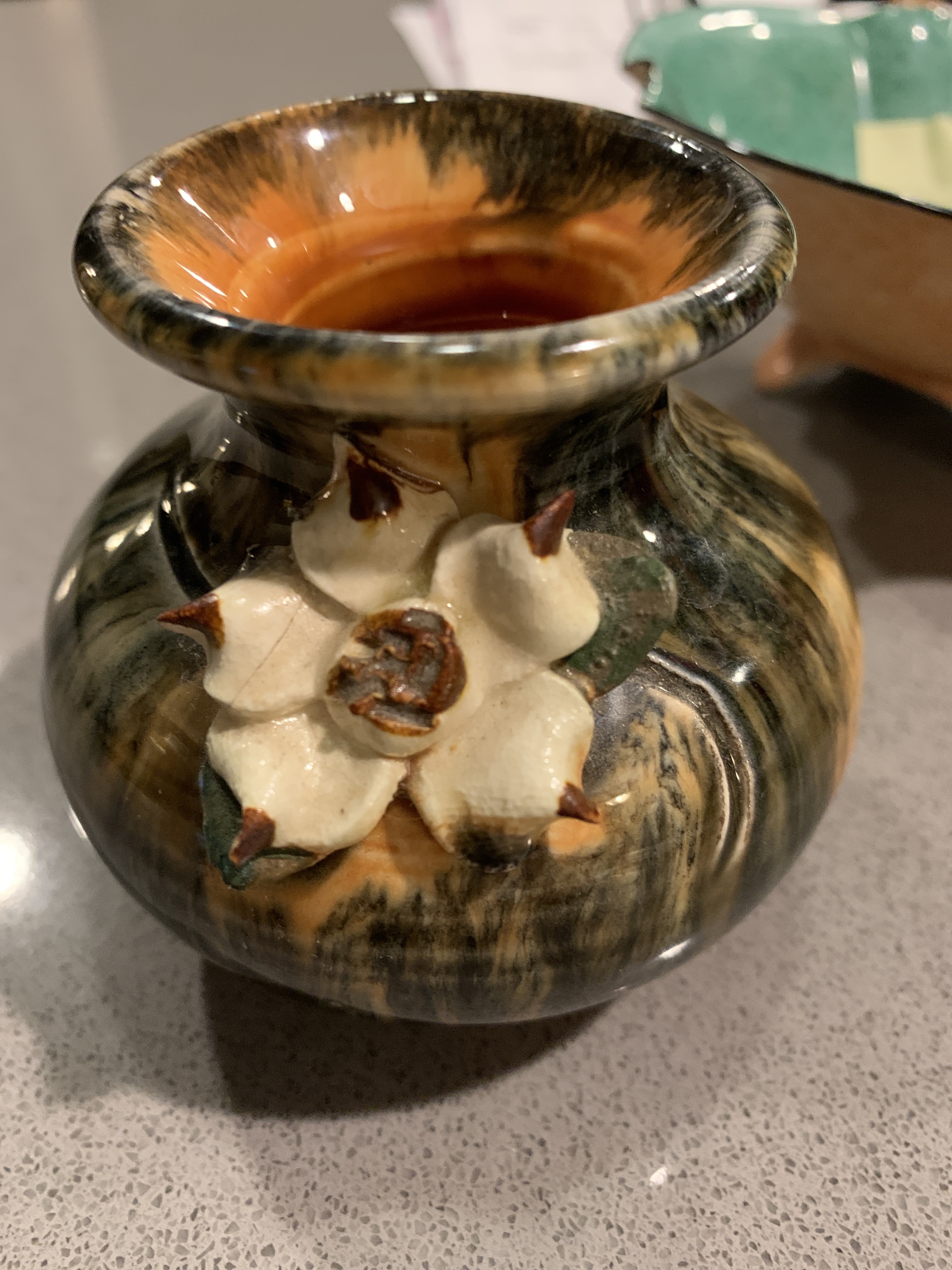 Linda, Thank you for your kind comments. Your lovely dogwood vase is not a unique colour as the green & orange glaze is a common glaze for her pottery. The piece is from the 1970s.