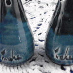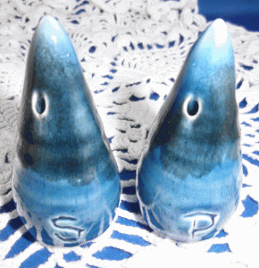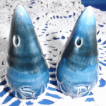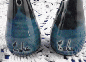 - 3b. Ineke pottery salt & pepper set, cone-shaped, blue [mark]