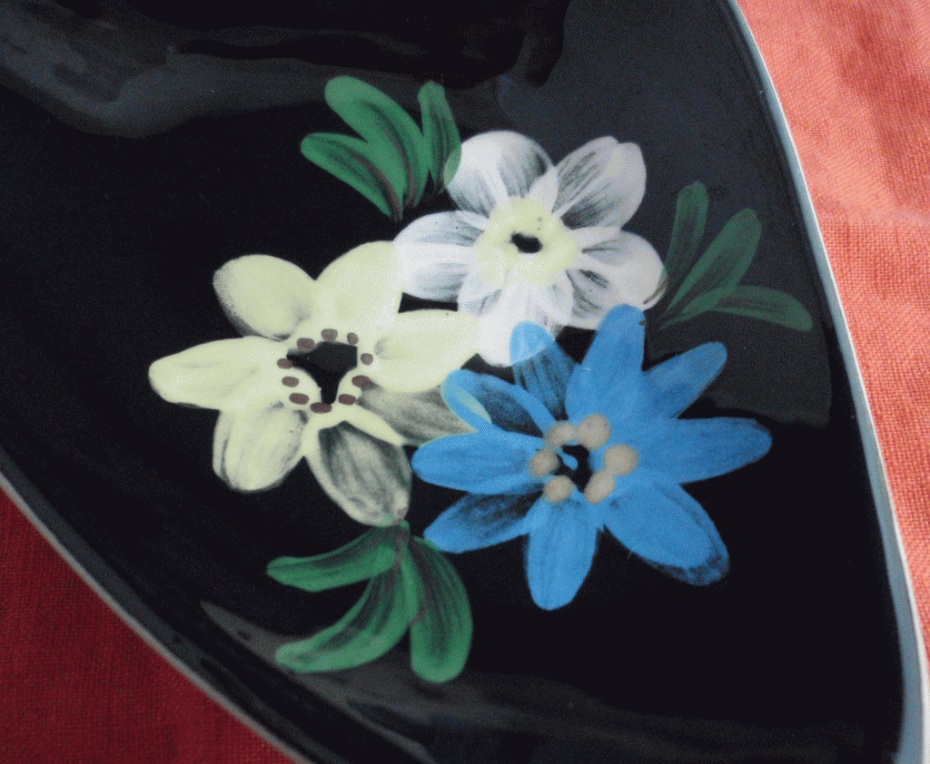 Colour: high gloss black background, pastel pink, blue, yellow flowers, green leaves