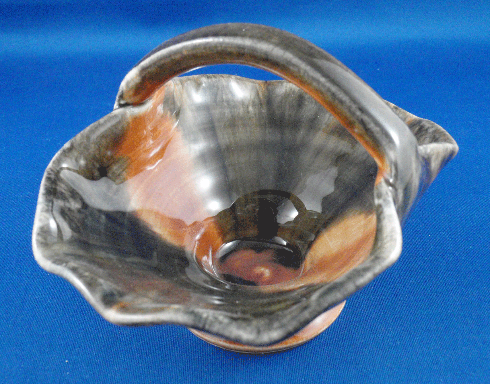 Description: Handled carrying basket, dark green or black drip glaze on caramel or sandstone colour, high-gloss glaze, unglazed rim, glazed base.