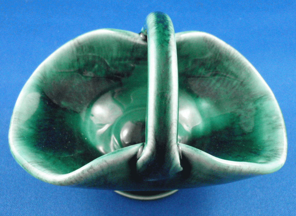 Description: Handled carrying basket, light green on dark green, high-gloss glaze, glazed rim, glazed base.