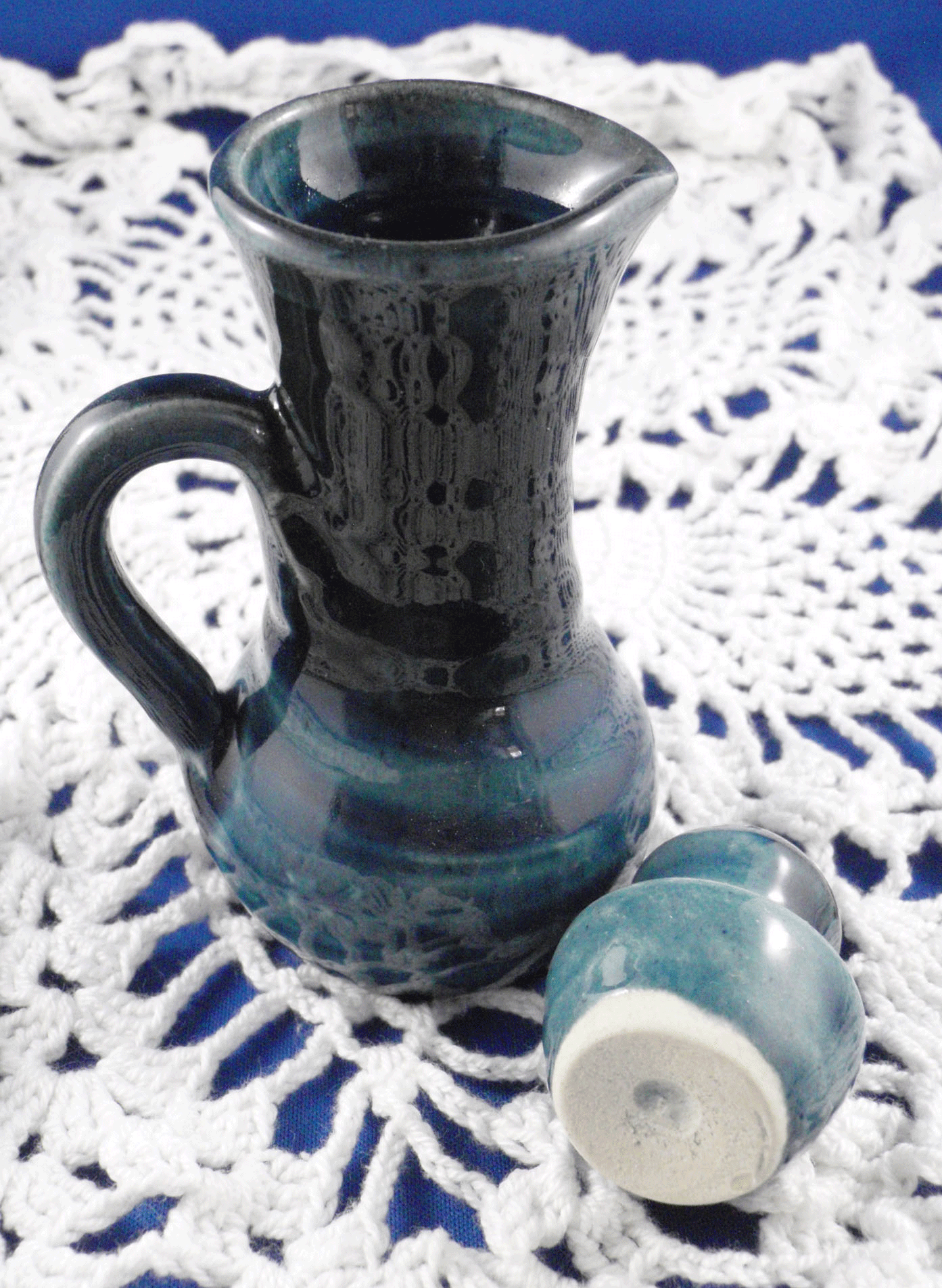 Description: handled, slight pour spout, cobalt blue on blue colour, glazed base, with stopper