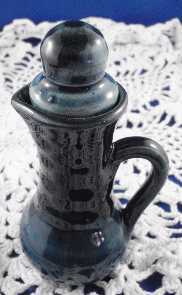 Description: handled, slight pour spout, cobalt blue on blue colour, glazed base, with stopper