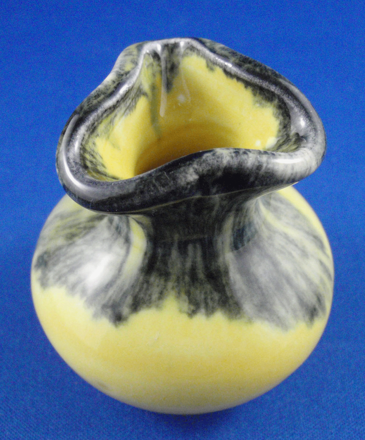 Description: ruffled or pinched top edge, bulbous shape, forest green on lemon yellow colour, unglazed base rim, glazed base