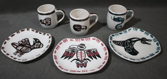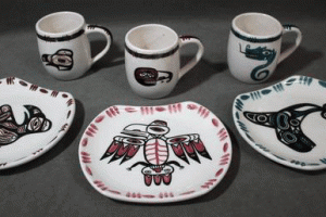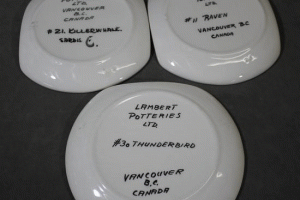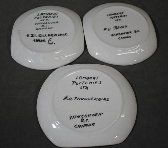 The Beginning: Lambert Potteries Ltd. began by producing similar items to pottery found in European countries. Lambert felt this needed to change; he was “in a new country doing a new thing in that country.” At the time, there was no established or indigenous BC ceramics or pottery industry – First Nations Coastal peoples did not make pottery; rather they used natural elements such as cedar bark for utilitarian and ritual wares – and only a few amateur BC potters used local clay as it was too expensive to import from Medicine Hat, AB and Saskatchewan. David Lambert realized the need to create pottery that represented BC’s coastal culture – he began to create “something that would be new and yet old at the same time”, pottery that represented the regional system, something that could be recognized as “truly pertaining to the country in which we live.” He incorporated West Coast first people’s designs used on everyday objects onto pottery and created WEST COAST INDIAN DESIGNS ON HAND MADE POTTERY.