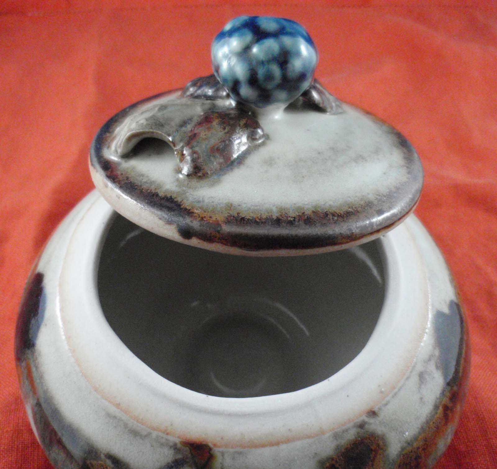 Shape: shallow, bulbous, lid has blackberry & leaves for finial
