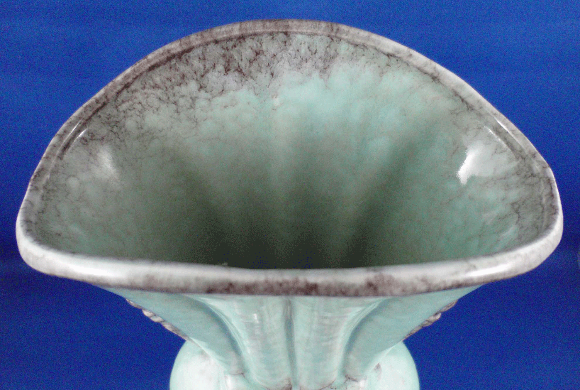 Shape: Upright fan shaped vase; fluted mid-section; tied bow design front & back; stylized handles